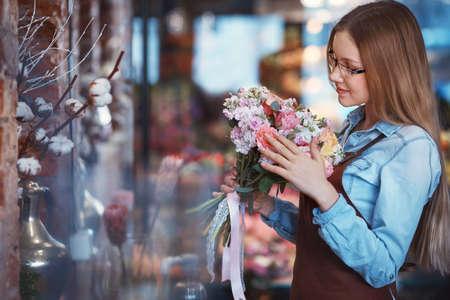 Florist woman creates flower arrangement. Small flower shop. European floral shop concept. Flowers delivery. Handsome fresh bunch
