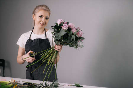 A pretty florist girl collects a bouquet of roses in a flower shop and creates a composition of flowers.