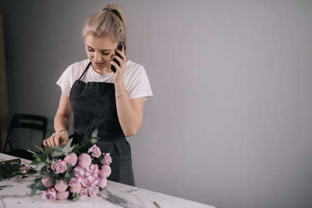 Young business woman florist wearing apron talking on mobile phone with client, holding wonderful composition of fresh plants on white background. Concept of working with flowers, floral business.