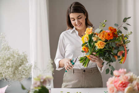 Portrait pretty young female florist arranging flowers in shop. Floristry, small business and people concept.