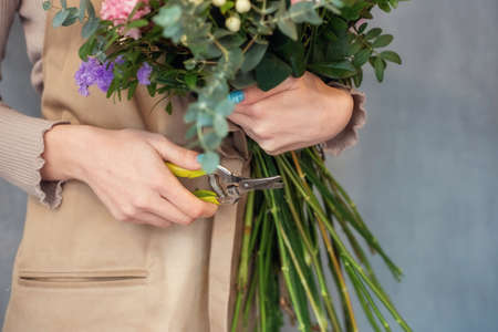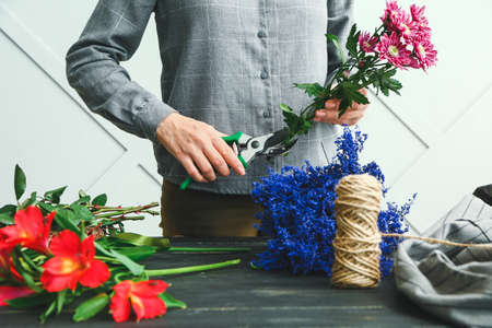 Florist cuts the stems of flowers in a bouquet with a secateurs. People in the process of work. The concept of a flower shop and flower delivery as a family business.