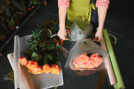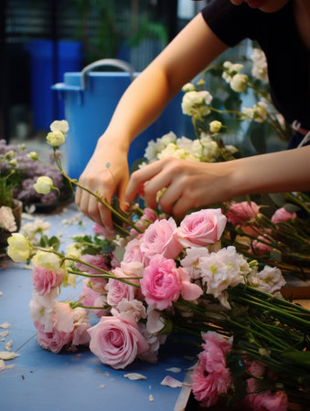 A florist works on preparing beautiful floral arrangement. Various flowers and materials lie on the table, emphasizing the artistic and inspiring atmosphere associated with floral design and presentation.
