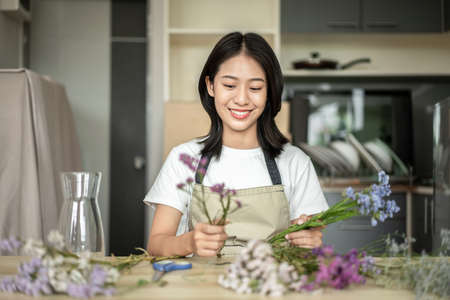 Weekend with her hobbies, Asian woman arranges a bouquet of flowers to decorate her home and beautify, Artificial flower arrangement, living room decoration ideas, Flowers bunch, Arts and crafts.