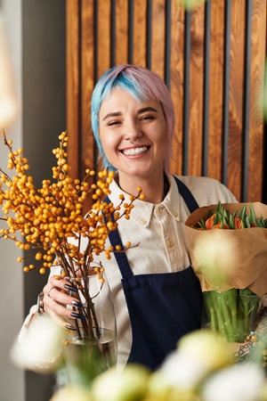A young woman with short dyed hair joyfully arranges colorful flowers in her shop.