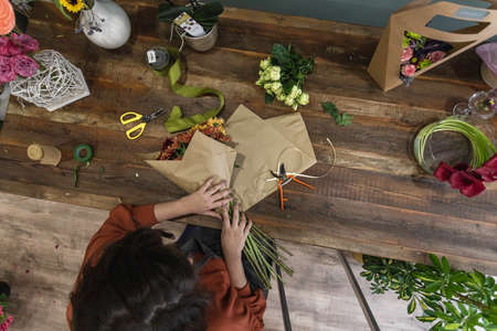 Flower shop. A woman seller sorts and collects bouquets of many fresh flowers. Top view on counter