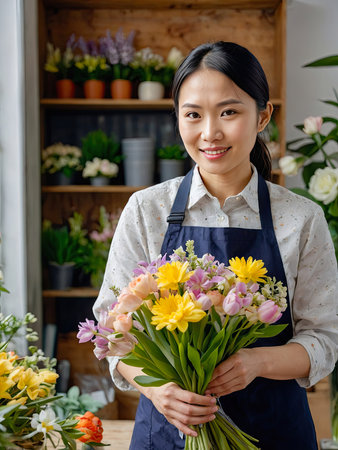 Asian woman florist collects a bouquet of spring flowers- fresh cut flowers in vases in flower shop and racks for sale, delivery for the holiday. Spring, March 8, women's Day, birthday. AI generated