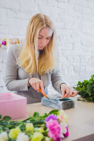 Professional woman floral artist, florist wraps oasis floral foam in cling film for flower arrangement at workshop, flower shop. Floristry, handmade and small business concept