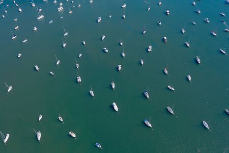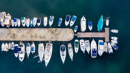 Aerial top view of water transport summertime vacation the sailboat harbor many beautiful yachts in ocean port