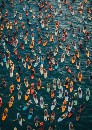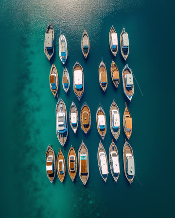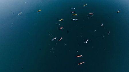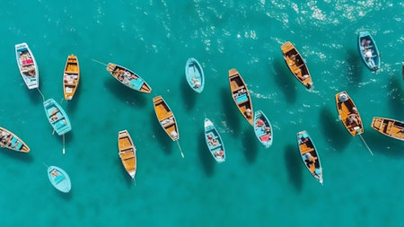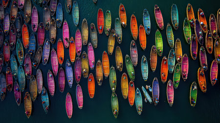 An overhead shot showcases numerous boats in various colors, arranged closely together on a dark body of water. The composition highlights a pattern formed by the vibrant vessels. This image exhibits a high-angle perspective with good lighting, suitable for design and illustrative projects, and could serve a variety of commercial purposes.