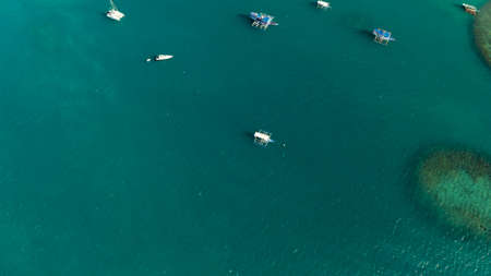 aerial view many boats in the turquoise lagoon, view from above. Seascape with blue bay and boats. traditional Filipino wooden outrigger boat called a banca. Summer and travel vacation concept