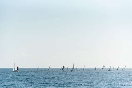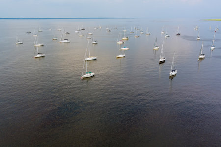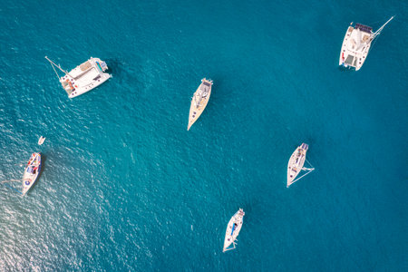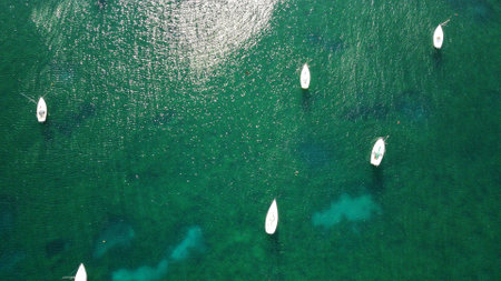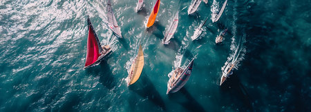 Group of small sail boats manoeuvring in the calm sea waters. Aerial view