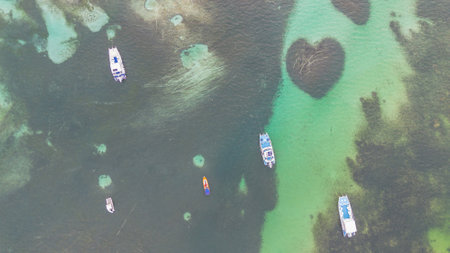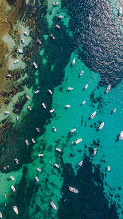 Spectacular aerial view of some yachts and small boats floating on a clear and turquoise sea, Seychelles in the Indian Ocean.Top view from drone