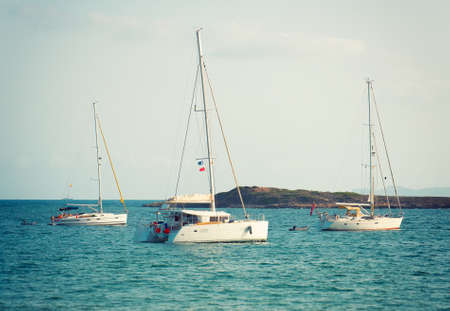 Yacht anchoring in crystal clear turquoise water in front of the tropical island, alternative lifestyle, living on a boat. Aerial view of yacht at anchor on turquoise water, showing luxury, wealth.