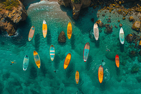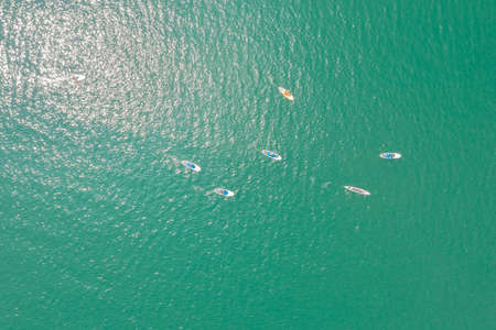 Aerial view of surfboards in turquoise water. Top view of surfboards on the beach