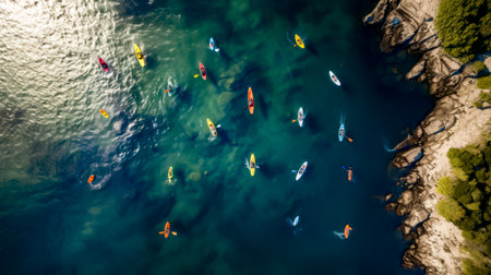 Group of people riding paddle boards on top of body of water. Generative AI.