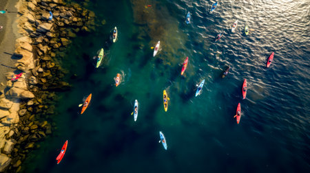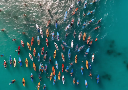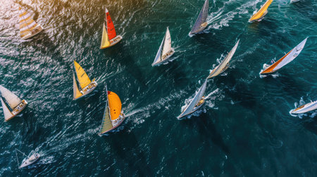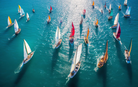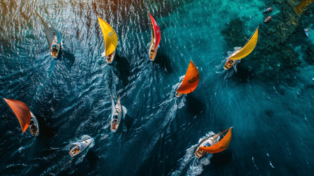 Aerial view of small boats in an eco-friendly regatta, colorful sails reflecting sustainable practices. Nautical event for World Oceans Day.