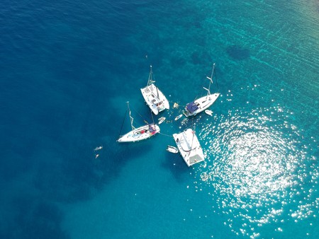 Aerial overhead drone shot of yachts on Adriatic sea near Vis Island in Croatia summer