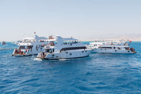 SHARM EL SHEIKH, EGYPT - JUNE 7, 2021: Yachts with tourists on board in the bay of the Red Sea