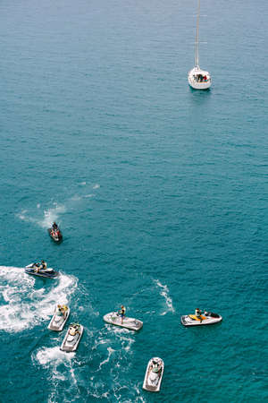 Overhead aerial drone view of yachts in mediterranean sea in summer sunny day near Nice, cote dazur, south France