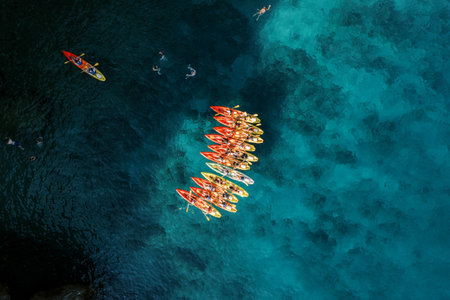 Captain boat sails towards a row of kayaks in the deep turquoise sea. Top view