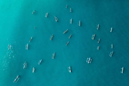 Many wooden traditional fishing boats on turquoise ocean surface in Indonesia. Aerial drone shot directly from above.