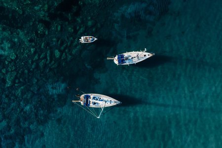 Sailing yachts anchored in blue sea, top view. Sailing yacht on dark background, aerial view.