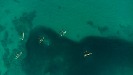 Generative AI : Aerial top down view of small Indonesian fisher boats in Mawun Beach Kuta Lombok Indonesia