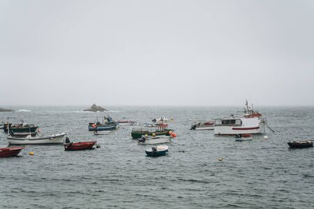 Corrubedo, Spain; Aug 10 2019: Typical fishing boats from northern spain floating in misty day