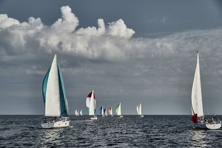 Sailboats compete in a sailing regatta at sunset, reflection of sails on water, multi-colored spinaker, boat number aft boats