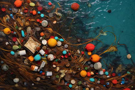 Plastic pollution in the ocean, view from above. Tons of plastic ends up in the ocean each year. AI-generated image, environmental issues