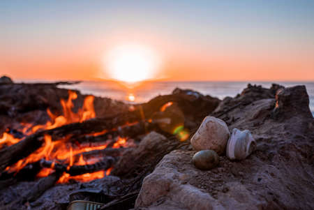 Beautiful bokeh on the beach at sunset time. Selective focus.