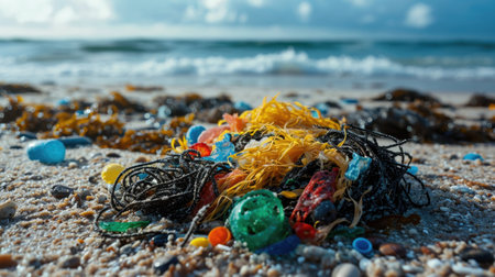 A macro shot of colorful microplastics entangled in seaweed on the beach, symbolizing ocean pollution
