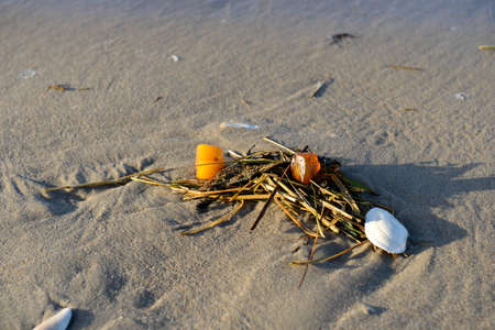 Dirty waste plastic garbage on the beach with outdoor sun low lighting.