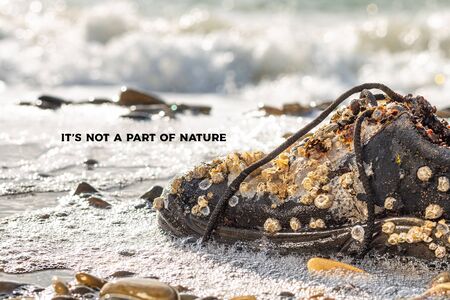 Concept of environmental protection and pollution. An old Shoe covered with shells lies on the seashore. Close up. In the background, the sea. The inscription It's not a part of nature .