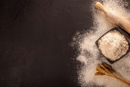 Close up Wooden rolling pin and flour. Bakery on a black stone background. Top view. Free space for text. Background for recipe