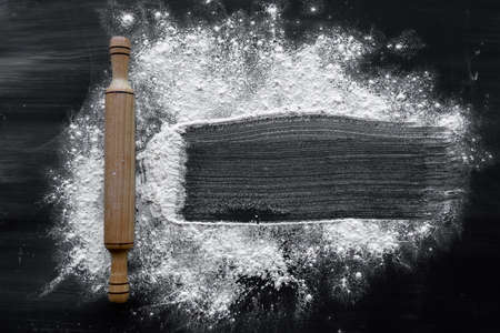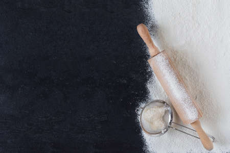 Sifted wheat flour over black surface with rolling pin and sieve top view. Baking background for your design.