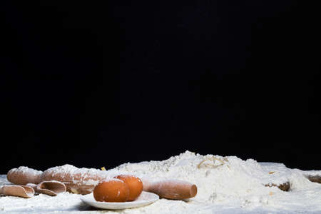 eggs, white wheat flour and other ingredients on the Board, in the kitchen while cooking food