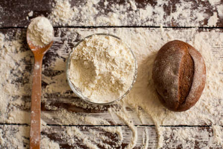 Two loaves of just baked tasty bread, bowl of flour and wooden spoon are on the brown table sprinkled with wheat flour