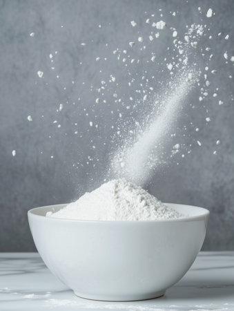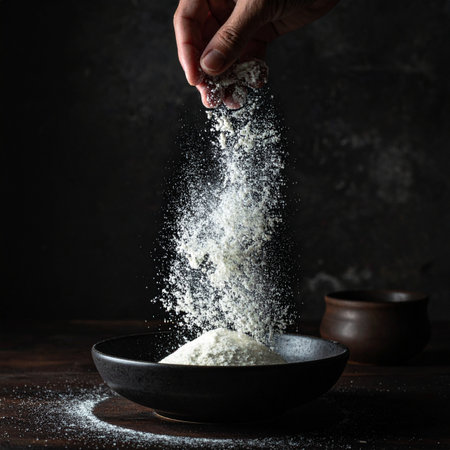 In the quiet of a rustic kitchen, a baker's hand gently dusts flour into a bowl, a cloud of white powder caught in a dramatic light.