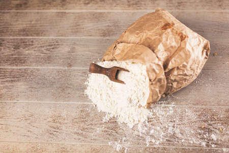 a paper bag of flour on the table, some white wheat flour spilled out of the bag