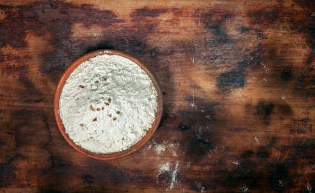 Flour sprinkled on a wooden table, with a smooth rectangular imprint for the inscription. Copy space.