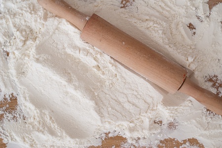 The process of making baking at home, flour and rolling pin are on a dark background.