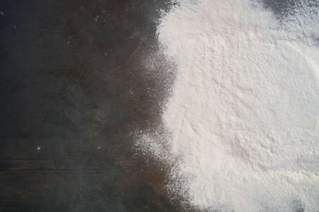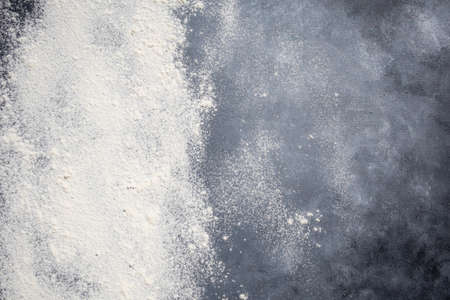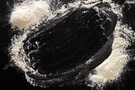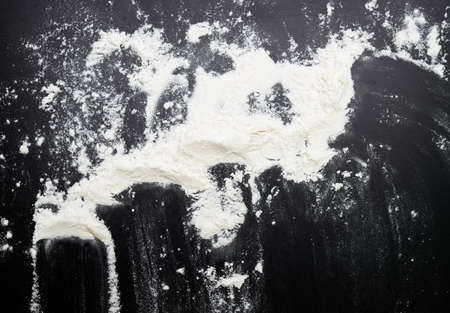 Baking class or recipe concept on black background, sprinkled wheat flour with free text copy space. Top view on blackboard or table. Cooking dough or pastry.