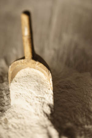 Horizontal overhead shot of used wooden chopping board and wooden spoon scattered with white flour.