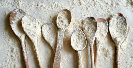 Baking concept. Top view of wooden spoons sprinkled with wheat flour on flour background.