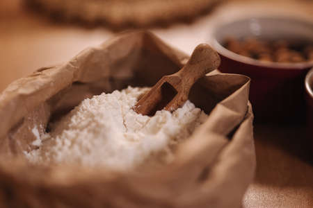 Home bakery, cooking traditional festive sweets. Preparing for making gingerbread dough on wooden table. New Year celebration traditions. Christmas mood. Close-up of flour