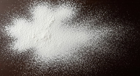 A close-up shot of a pile of white flour with fine particles scattering into the air, placed on a dark textured background, ideal for cooking and baking themes.