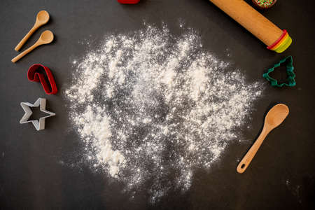 Christmas time cooking concept with flour and cookies forms on dark wooden table