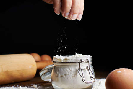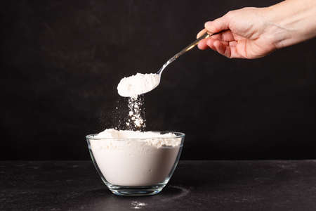 Female hand sprinkles flour into a bowl with a spoon on a black background