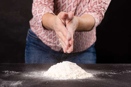 Female hands sprinkle flour on a black background. The concept of preparation of dough for baking.